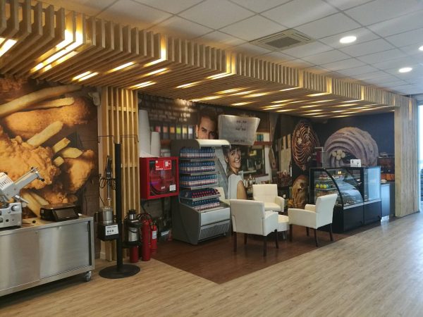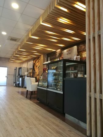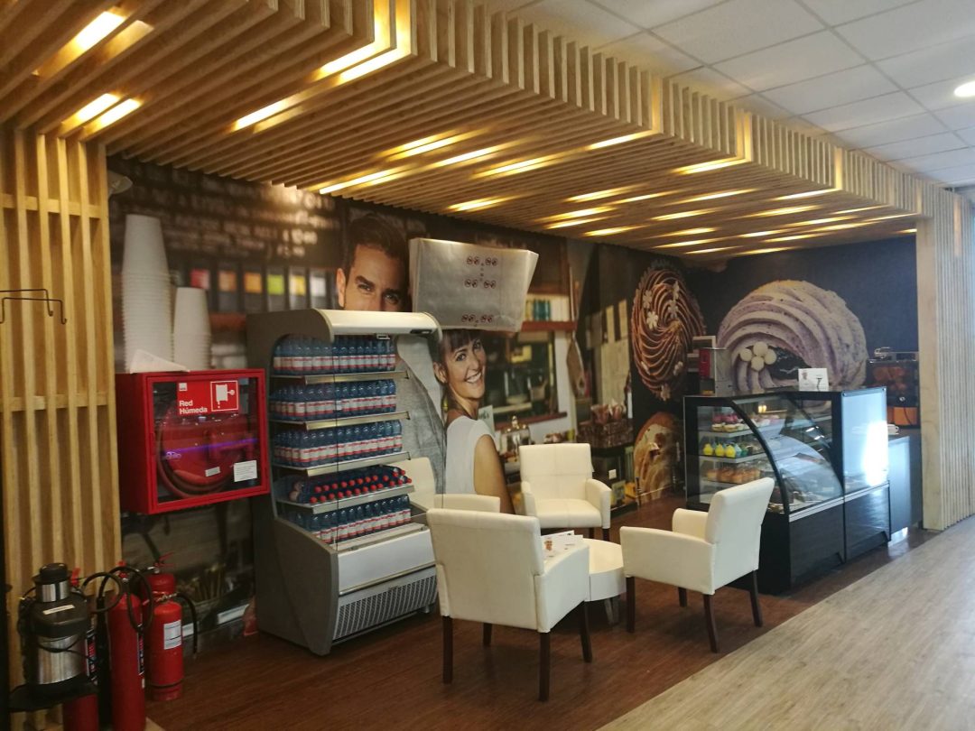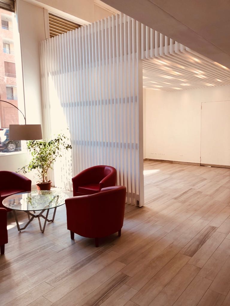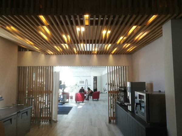 En este caso la elección de elementos repetitivos de madera retro iluminados “aleatoriamente” pasan a ser elementos compositivos tanto vertical como horizontalmente y adquieren una nueva forma de interpretarlos, junto con generar la iluminación requerida para cada caso. Al dialogar estos elementos con equipos y productos de alto brillo y tecnología, generan un contraste muy interesante. Sin embargo la madera en este caso no pasa a ser un elemento rústico, como se podría pensar en primera instancia, más bien pasa a ser un elemento que cobija y otorga calidez a los espacios, pero con una apariencia mas moderna (como un panel LED que tamiza la luz) y con unas terminaciones muy finas y elegantes tanto a la vista como por sus detalles constructivos.