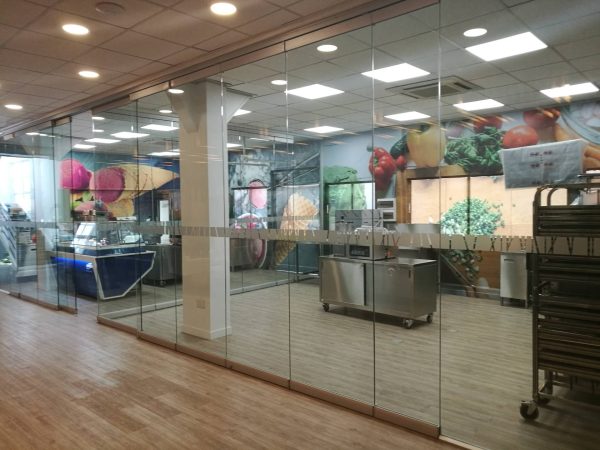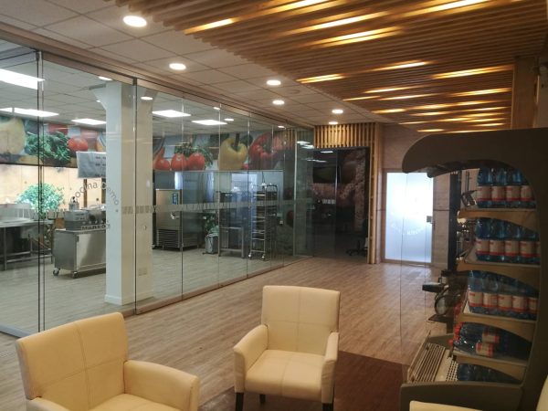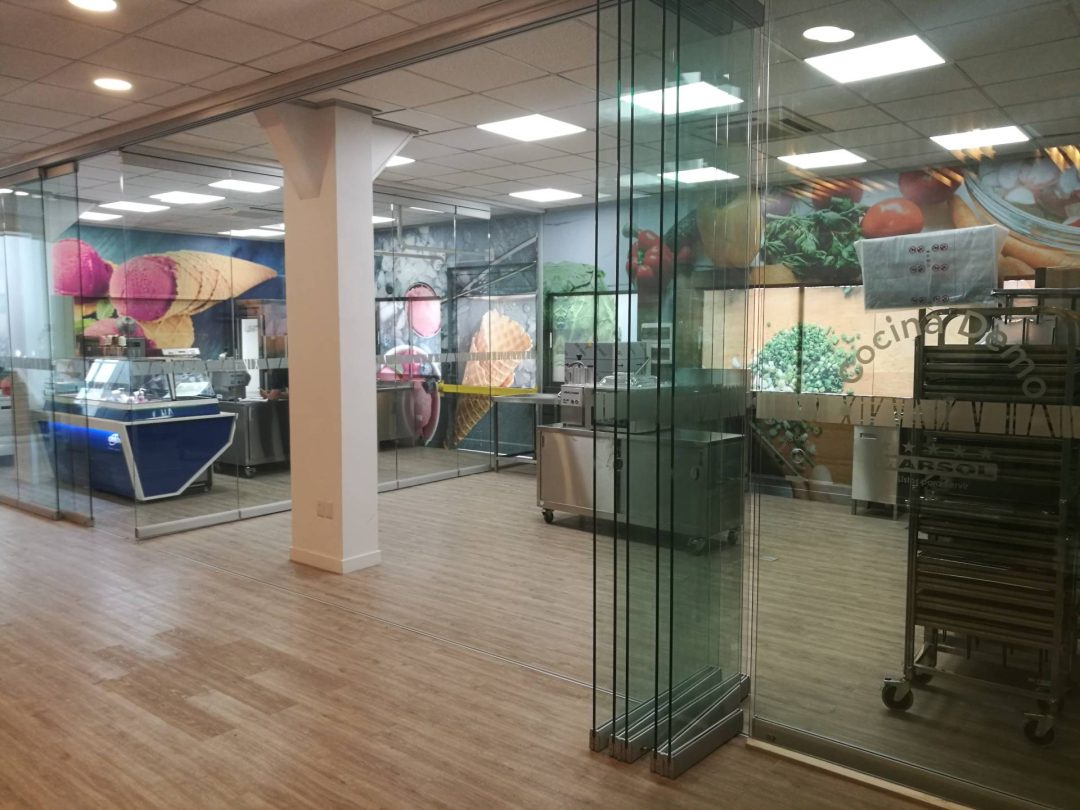 Junto con el trabajo de las maderas y el contraste con los equipos, se incorpora un tercer material, en este caso el vidrio, sin perfilería para generar espacios mas limpios y puros, sin impedimento visual. Existía la necesidad de poder separar espacios y ambientes dentro del programa, sin embargo que estas divisiones pudiesen “desaparecer” o ser desplazadas para poder abrir el showroom por completo cuando sea necesario.